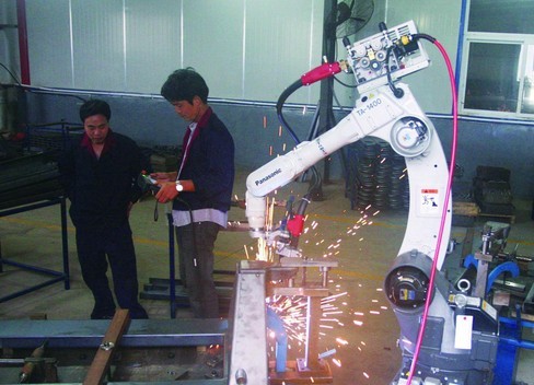 點(diǎn)焊對(duì)所用的機(jī)器人的要求是不很高的。因?yàn)辄c(diǎn)焊只需點(diǎn)位控制,至于焊鉗在點(diǎn)與點(diǎn)之間的移動(dòng)軌跡沒有嚴(yán)格要求。這也是機(jī)器人最早只能用于點(diǎn)焊的原因。點(diǎn)焊用機(jī)器人不僅要有足夠的負(fù)載能力,而且在點(diǎn)與點(diǎn)之間移位時(shí)速度要快捷,動(dòng)作要平穩(wěn),定位要準(zhǔn)確,以減少移位的時(shí)間,提高工作效率。點(diǎn)焊機(jī)器人需要有多大的負(fù)載能力,取決于所用的焊鉗形式。對(duì)于用與變壓器分離的焊鉗,30~45kg負(fù)載的機(jī)器人就足夠了。但是,這種焊鉗一方面由于二次電纜線長,電能損耗大,也不利于機(jī)器人將焊鉗伸入工件內(nèi)部焊接;另一方面電纜線隨機(jī)器人運(yùn)動(dòng)而不停擺動(dòng),電纜的損壞較快。因此,目前逐漸增多采用一體式焊鉗。這種焊鉗連同變壓器質(zhì)量在70kg左右。考慮到機(jī)器人要有足夠的負(fù)載能力,能以較大的加速度將焊鉗送到空間位置進(jìn)行焊接,一般都選用100~150kg負(fù)載的重型機(jī)器人。為了適應(yīng)連續(xù)點(diǎn)焊時(shí)焊鉗短距離快速移位的要求。新的重型機(jī)器人增加了可在0.3s內(nèi)完成50mm位移的功能。這對(duì)電機(jī)的性能,微機(jī)的運(yùn)算速度和算法都提出更高的要求。