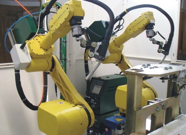 (1)激光和電弧復合加熱焊接機器人激光焊接機器人可焊出窄而深的焊縫,電弧焊接機器人可焊出寬而淺的焊縫;前者投資大,后者成本低,兩者特性組合,會大大提高焊接機器人效率。激光和電弧復合加熱焊接機器人的焊炬設計特別重要,兩熱源的夾角要盡可能小,焊炬也設計成激光+雙電弧電源。該方法已在4~8mm厚的鋼結(jié)構(gòu)中使用,正擬用于更薄的汽車部件生產(chǎn)和鋁合金焊接機器人中。激光除了在焊接機器人及精密切割中應用外,還在摩擦面形成儲油細花紋或重熔復合層,以提高耐磨性方面應用。
