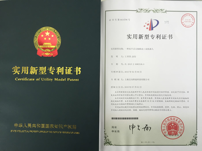 一種水平式五軸聯動工業機器人專利證書
